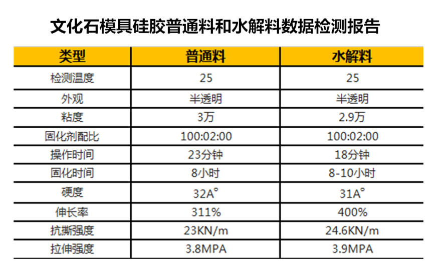 根據(jù)下面的文化石模具硅膠的普通料和水解料數(shù)據(jù)檢測(cè)報(bào)告可以看出,水解料生產(chǎn)出來的模具硅膠看上去和普通料生產(chǎn)的相關(guān)不了多少,但這問題在使用一段時(shí)間后就會(huì)明顯的凸顯出來。